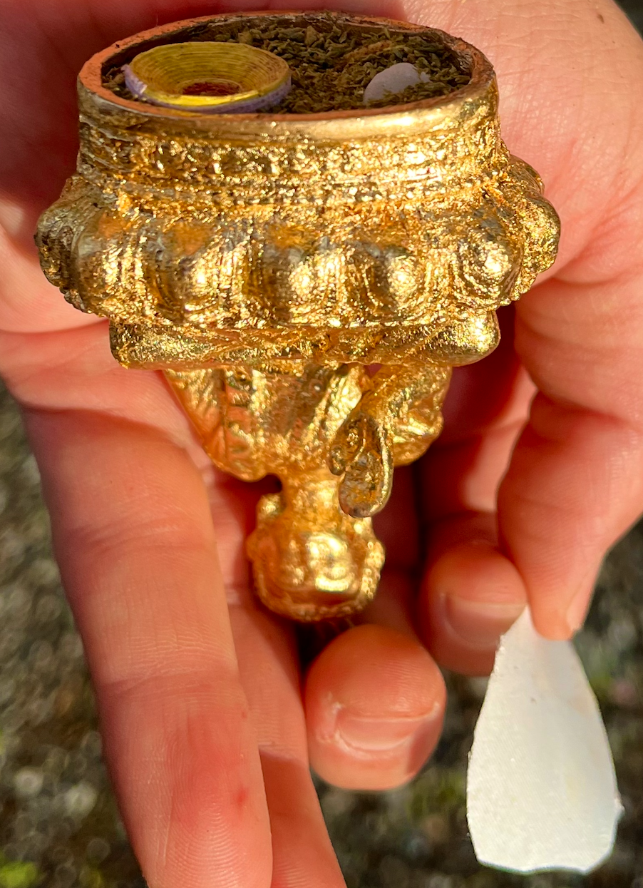 9. Filled spaces with incense and a white Tibetan lama made medicine tablet. This was for a close student, so I included a piece of cloth from one of my personal ritual retreats.